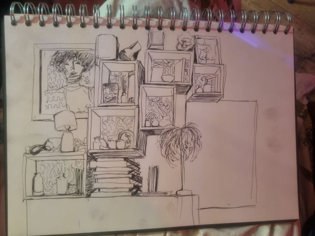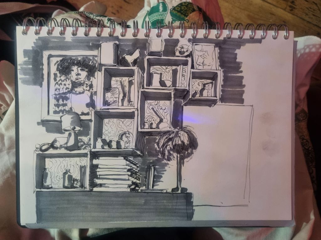 Recently I’ve visited a really cool place called London Nights Café and they had this very lovely shelfs staking up on each other, all of them filled with little trinkets and just the most random stuff honestly. I got cosy in a big armchair with some tea and the process could begin. I first drew with my it with my fountain pen (right image). I have to tell you I got real cosy as I don’t normally put this much detail, but I just kept drawing and drawing. Once I had enough of my fountain pen I had the idea of adding more shadows in with a marker.