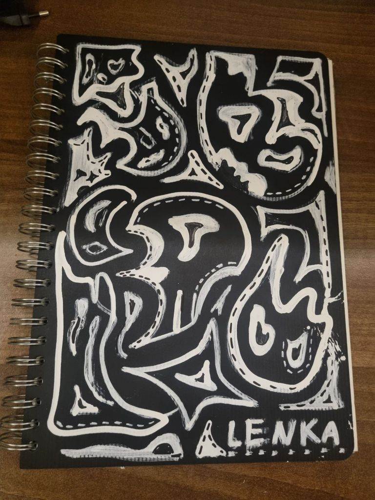 For this one I didn’t even draw anything on paper I just grabbed the marker and started drawing. I felt good it felt right to just draw some shapes and then more shapes into it to make something like creatures. I wanted the sketchbook cover to work from multiple sides and I think I nailed it. Once I had the basic white shapes I waited for it to dry and then went in with black Posca marker to add more details and such.