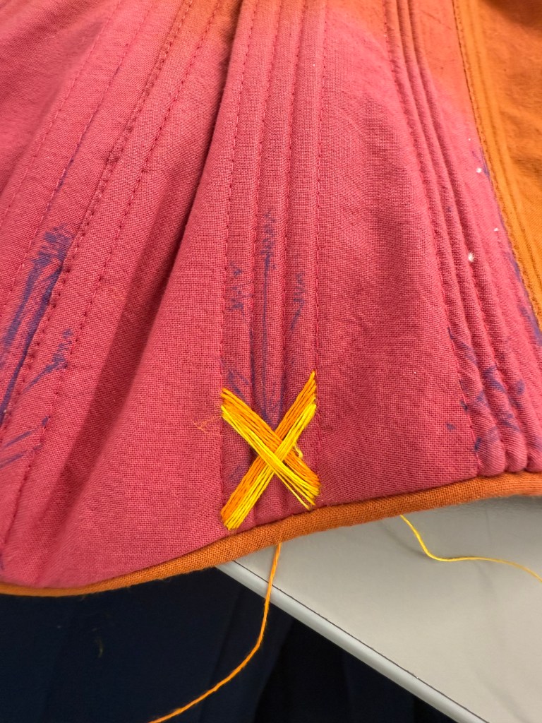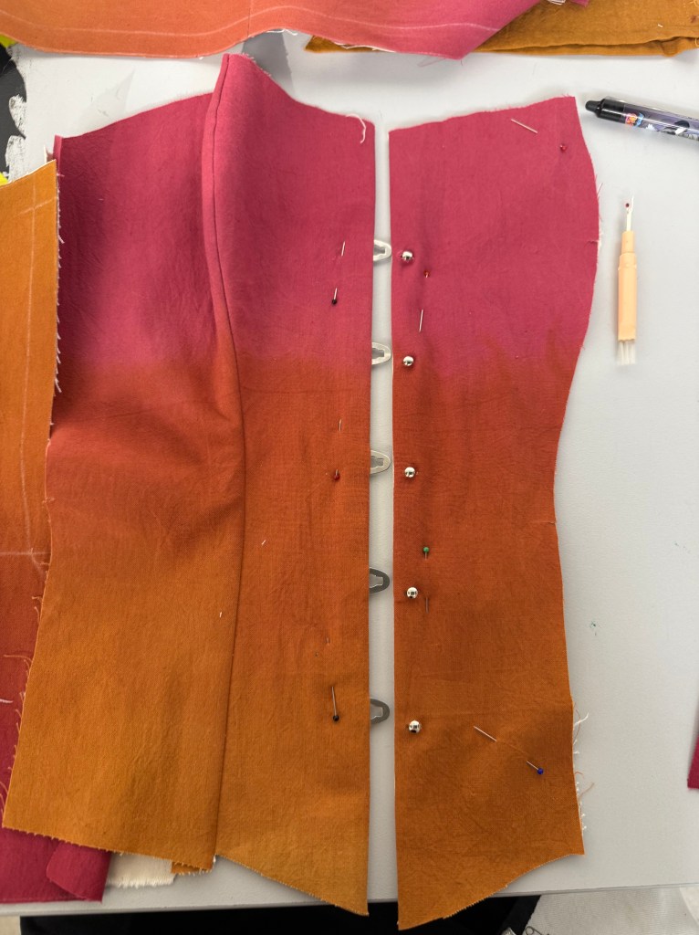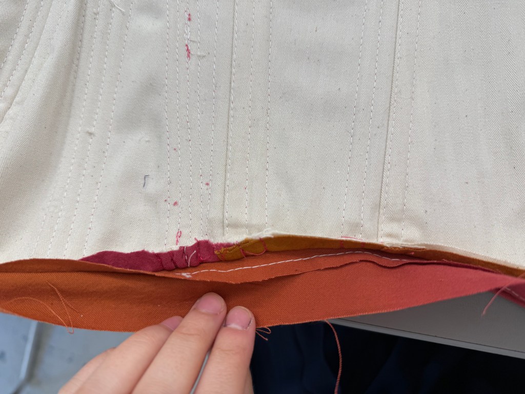 Historical dress made out of red shanzaan taffeta, inspired by the 1850s. I research and recreated some of the historical techniques in this dress. I drape the pattern my self, using photos of surviving garments as my reference.